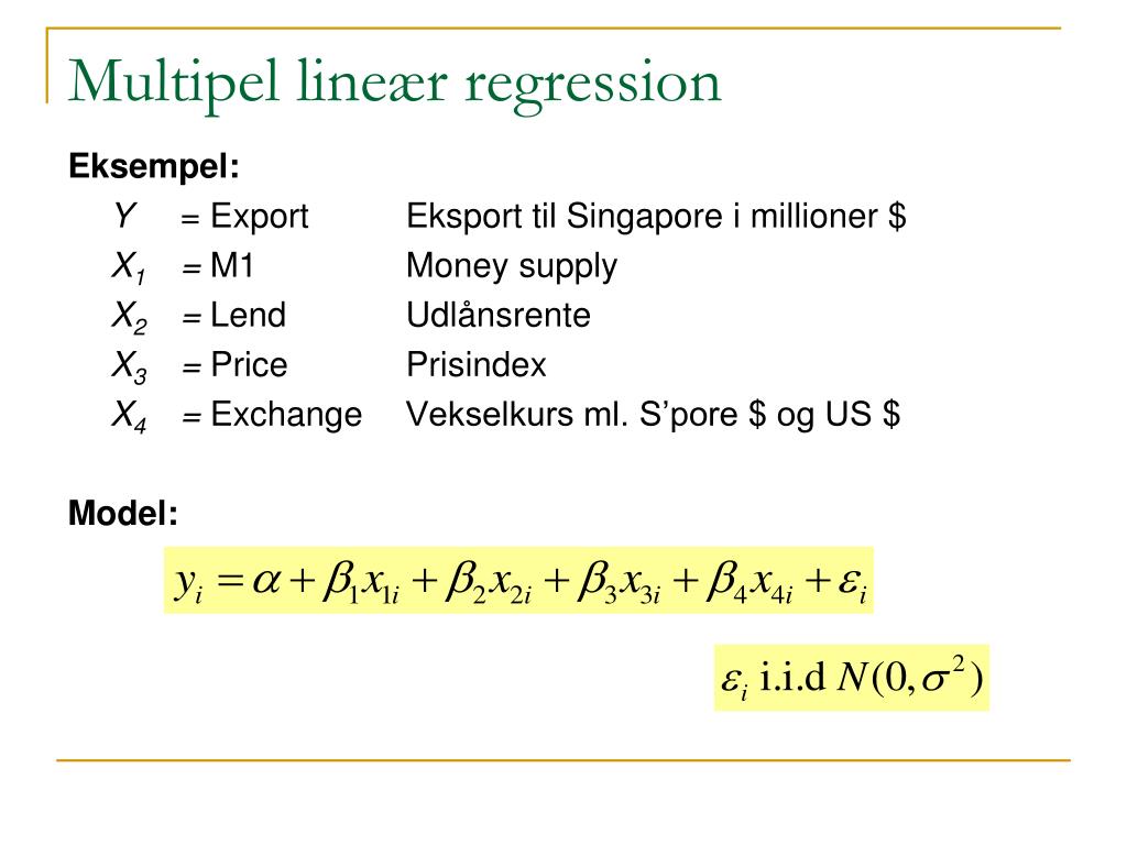 Multipel lineær regression Eksempel: Y = Export Eksport til Singapore i millioner $ X1 = M1 Money supply X2 = Lend Udlånsrente X3 = Price Prisindex X4 = Exchange Vekselkurs ml. S’pore $ og US $ Model: