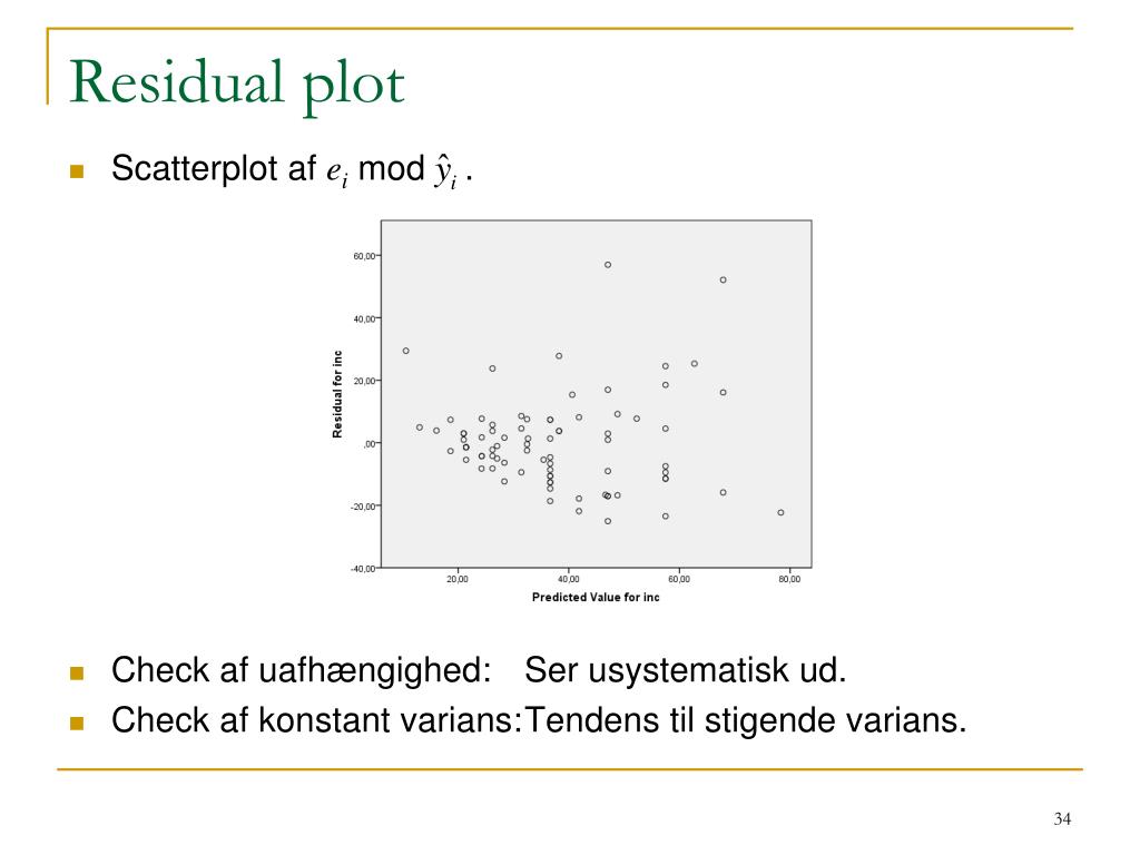 Residual plot • Scatterplot af ei mod . • Check af uafhængighed: Ser usystematisk ud. • Check af konstant varians: Tendens til stigende varians.