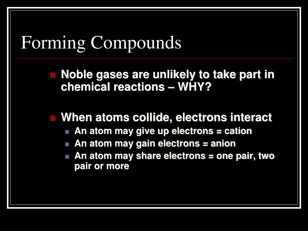 Forming Compounds • Noble gases are unlikely to take part in chemical reactions – WHY? • When atoms collide, electrons interact • An atom may give up electrons = cation • An atom may gain electrons = anion • An atom may share electrons = one pair, two pair or more