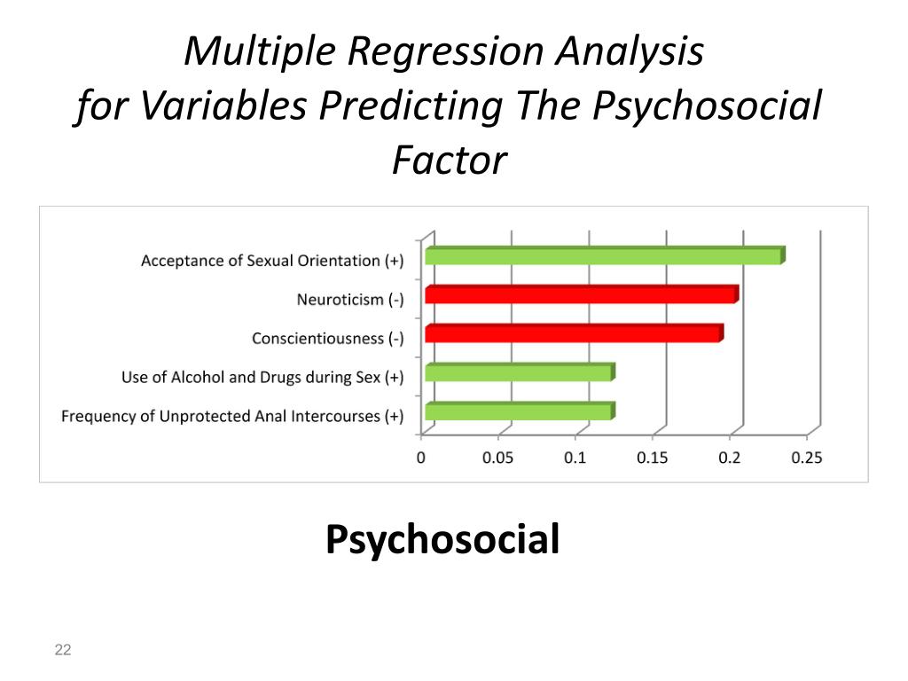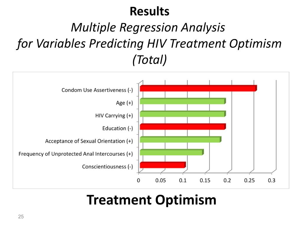 Hypotheses • HIV Treatment Optimism would be positively related to: • Acceptance of Sexual Orientation • Openness to Experience • Extraversion • ImpSS • Frequency of Unprotected Anal Sex • And negatively related to: • Conscientiousness • Neuroticism • Agreeableness