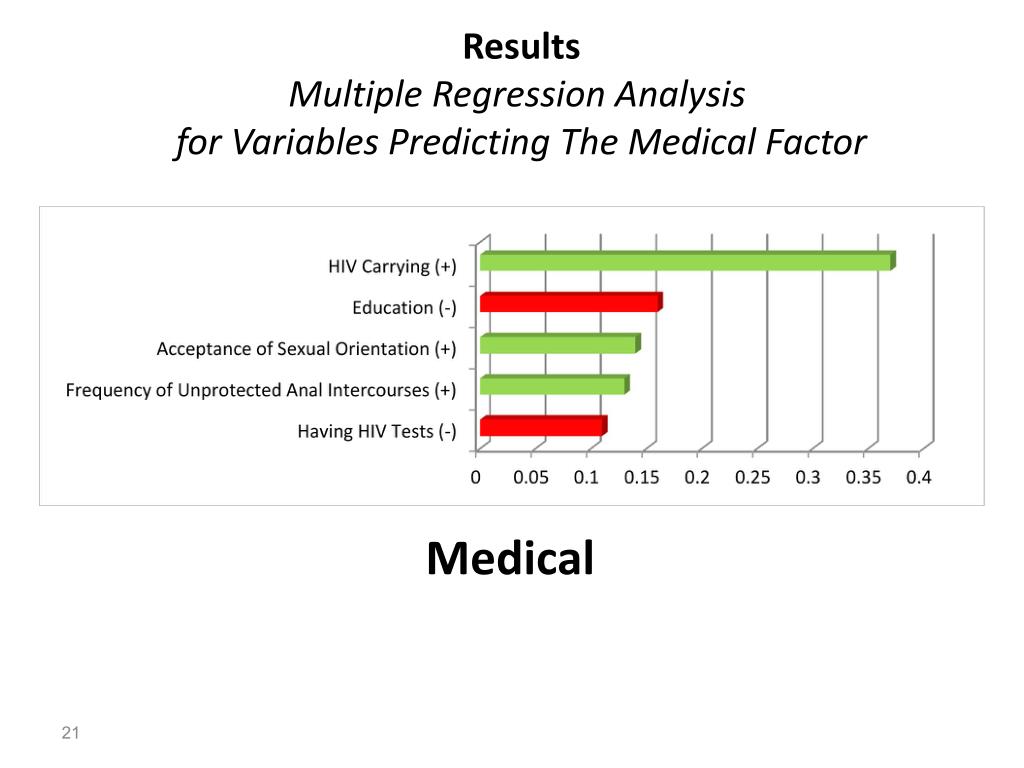 ResultsThe Medical Factor (a = 0.78)(explained variance – 15.03%) • Life with HIV is not easy at all and requires medical follow-up and many vaccinations (R) • HIV medications have side effects (R) • HIV may cause other medical problems (R) • HIV carrying may cause earlier and faster aging (R)