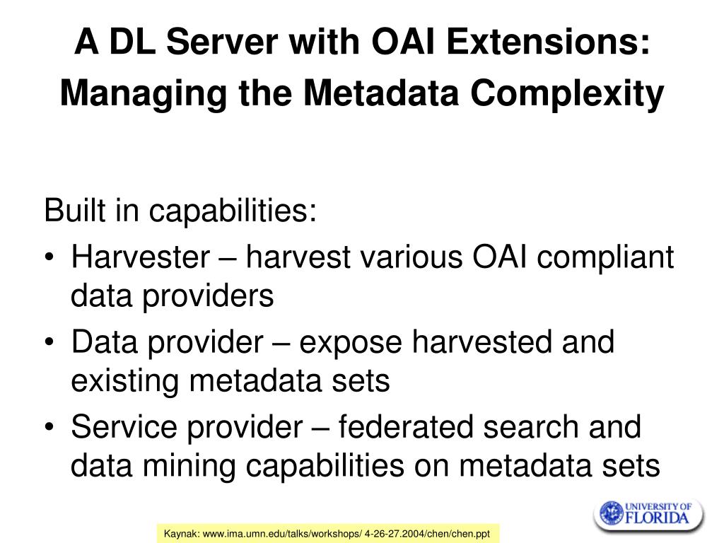 A DL Server with OAI Extensions: Managing the Metadata Complexity Built in capabilities: • Harvester – harvest various OAI compliant data providers • Data provider – expose harvested and existing metadata sets • Service provider – federated search and data mining capabilities on metadata sets Kaynak: www.ima.umn.edu/talks/workshops/ 4-26-27.2004/chen/chen.ppt