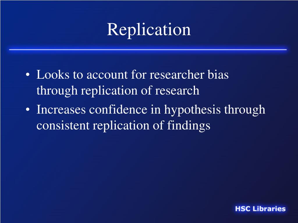 Replication • Looks to account for researcher bias through replication of research • Increases confidence in hypothesis through consistent replication of findings