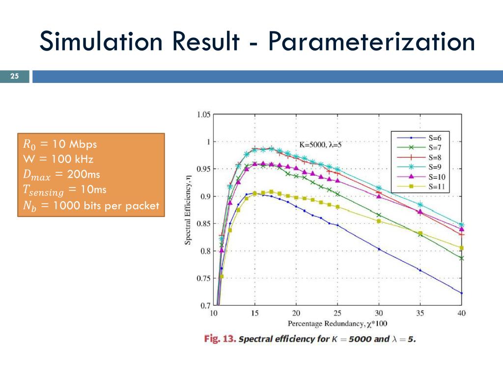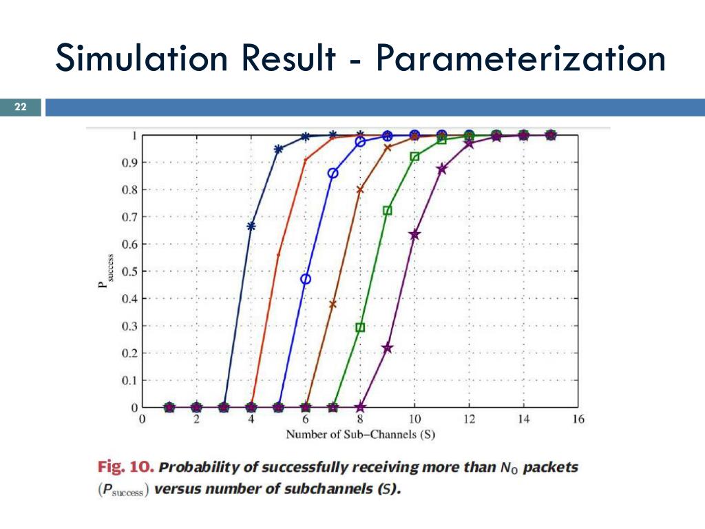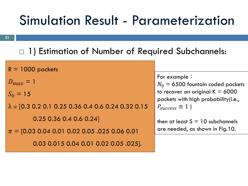 Simulation Result - Parameterization • 1) Estimation of Number of Required Subchannels: • R = 1000 packets= 1 • = 15 • = [0.3 0.2 0.1 0.25 0.36 0.4 0.6 0.24 0.32 0.15 • 0.25 0.36 0.4 0.6 0.24] • = [0.03 0.04 0.01 0.02 0.05 .025 0.06 0.01 0.03 0.015 0.04 0.01 0.02 0.05 .025]. For example: = 6500 fountain coded packets to recover an original K = 6000 packets with high probability(i.e., ) then at least S = 10 subchannels are needed, as shown in Fig.10.
