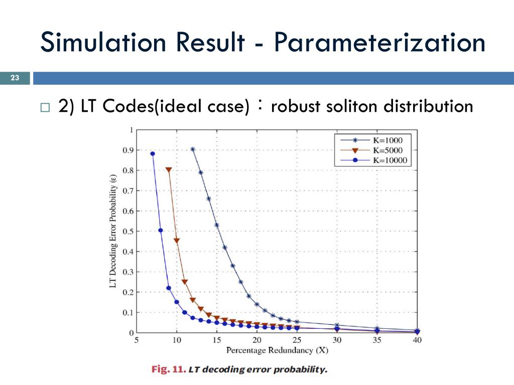 Simulation Result - Parameterization • 2) LT Codes(ideal case):robust soliton distribution