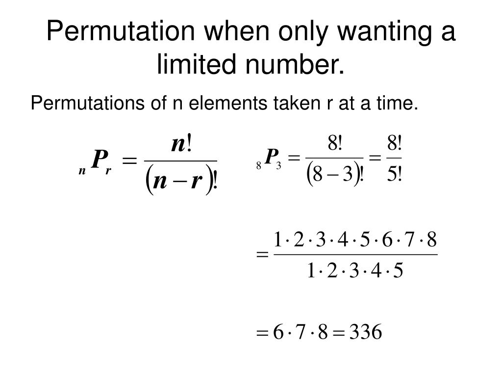 Permutation when only wanting a limited number. Permutations of n elements taken r at a time.