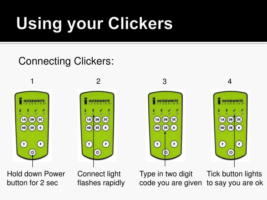 Using your Clickers Connecting Clickers: 1 2 3 4 Hold down Power button for 2 sec Connect light flashes rapidly Type in two digit code you are given Tick button lights to say you are ok