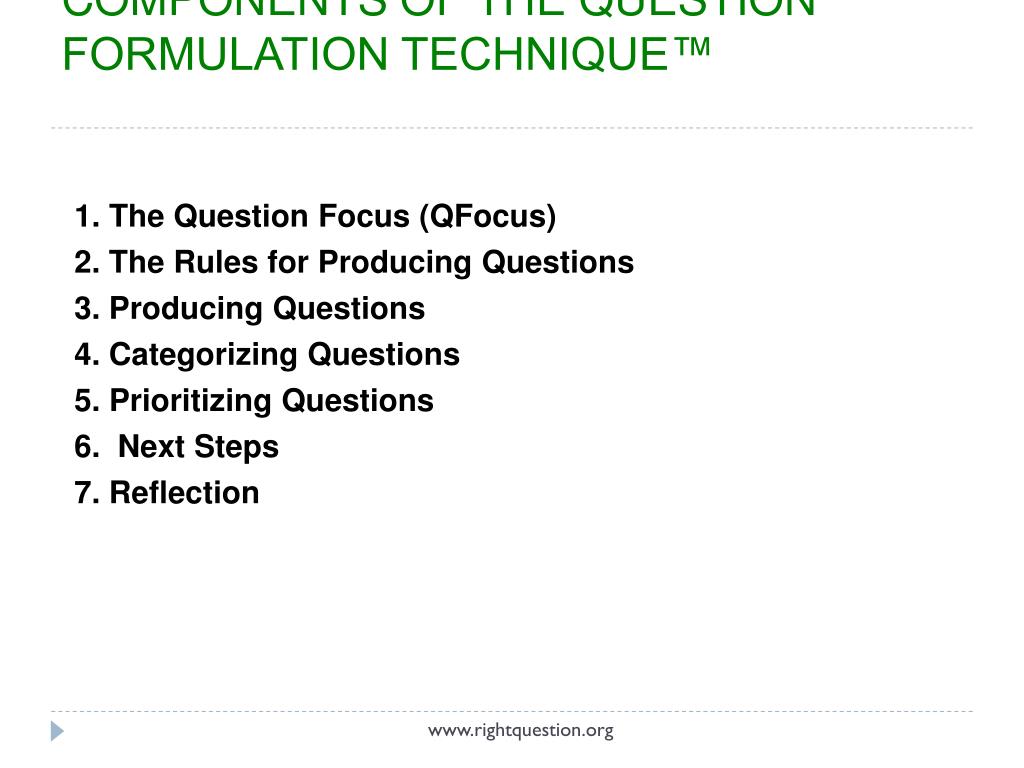 COMPONENTS OF THE QUESTION FORMULATION TECHNIQUE™ 1. The Question Focus (QFocus) 2. The Rules for Producing Questions 3. Producing Questions 4. Categorizing Questions 5. Prioritizing Questions 6. Next Steps 7. Reflection www.rightquestion.org
