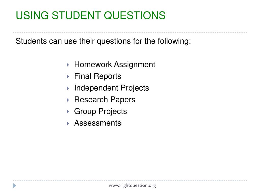 USING STUDENT QUESTIONS Students can use their questions for the following: • Homework Assignment • Final Reports • Independent Projects • Research Papers • Group Projects • Assessments www.rightquestion.org