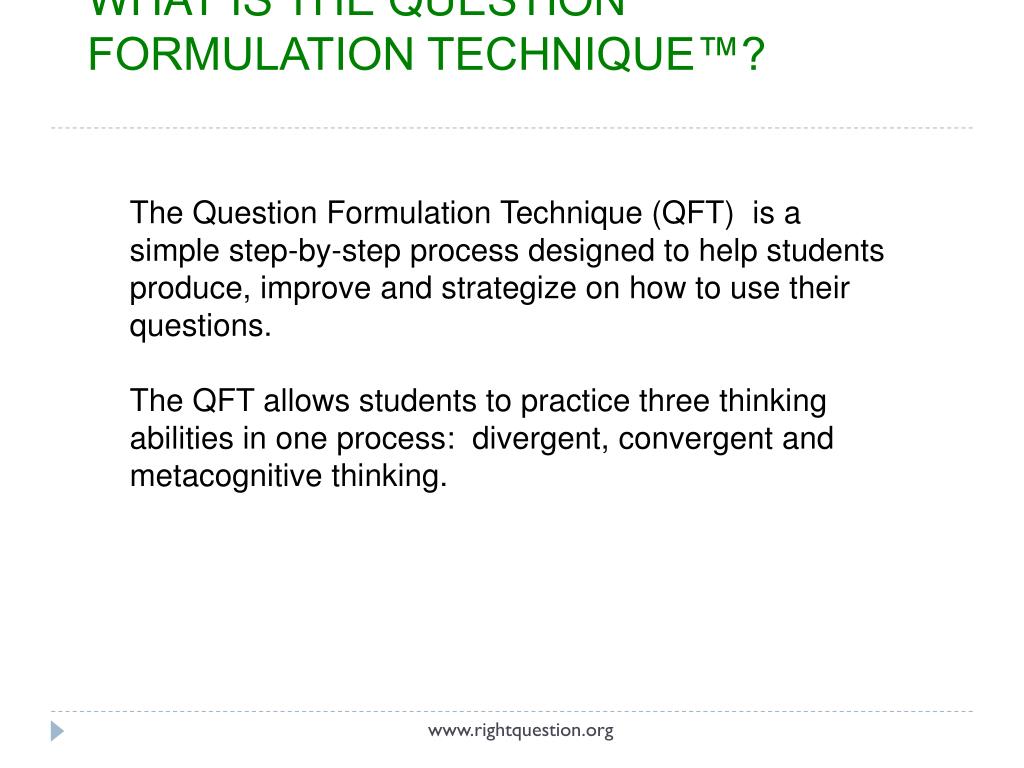 WHAT IS THE QUESTION FORMULATION TECHNIQUE™? The Question Formulation Technique (QFT) is a simple step-by-step process designed to help students produce, improve and strategize on how to use their questions. The QFT allows students to practice three thinking abilities in one process: divergent, convergent and metacognitive thinking. www.rightquestion.org