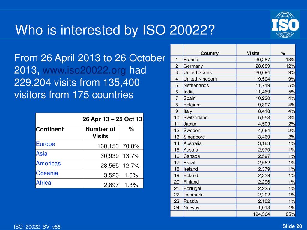 Whoisinterested by ISO 20022? From 26 April 2013 to 26 October 2013, www.iso20022.orghad 229,204visits from 135,400 visitors from 175 countries ISO_20022_SV_v86