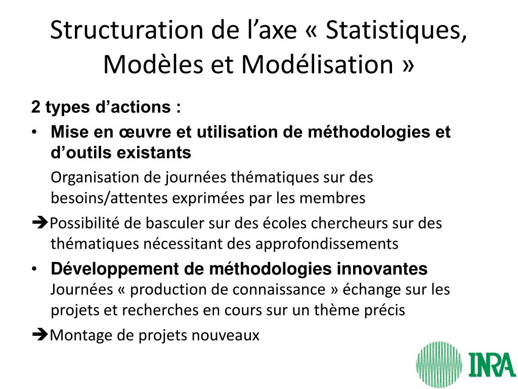 Structuration de l’axe « Statistiques, Modèles et Modélisation » • 2 types d’actions : • Mise en œuvre et utilisation de méthodologies et d’outils existants • Organisation de journées thématiques sur des besoins/attentes exprimées par les membres • Possibilité de basculer sur des écoles chercheurs sur des thématiques nécessitant des approfondissements • Développement de méthodologies innovantes Journées « production de connaissance » échange sur les projets et recherches en cours sur un thème précis • Montage de projets nouveaux