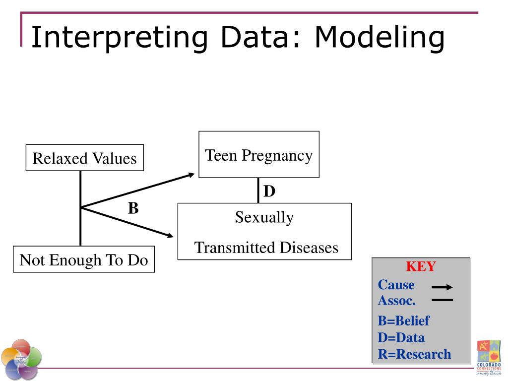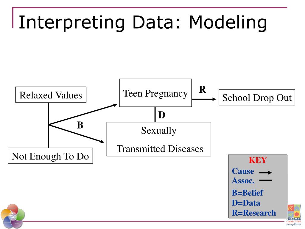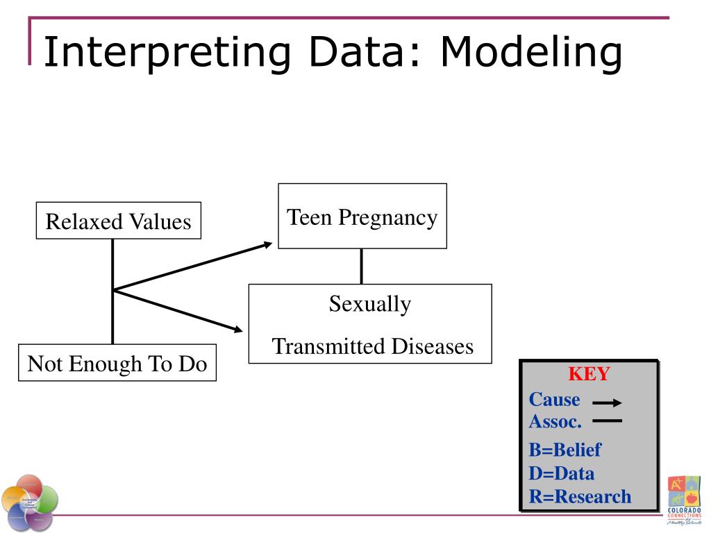 Teen Pregnancy R School Drop Out D Sexually Transmitted Diseases Interpreting Data: Modeling Relaxed Values B Not Enough To Do KEY Cause Assoc. B=Belief D=Data R=Research KEY B=Belief D=Data R=Research