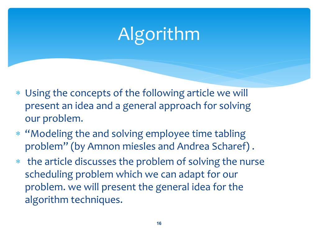 Algorithm • Using the concepts of the following article we will present an idea and a general approach for solving our problem. • “Modeling the and solving employee time tabling problem” (by Amnonmiesles and Andrea Scharef) . • the article discusses the problem of solving the nurse scheduling problem which we can adapt for our problem. we will present the general idea for the algorithm techniques.