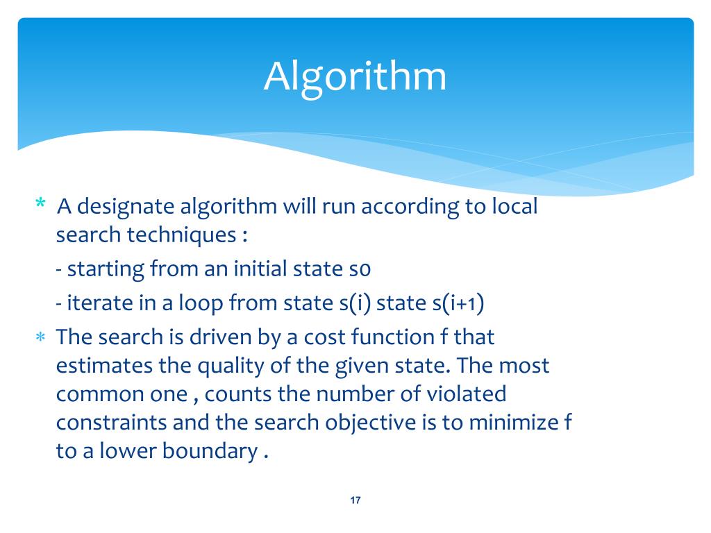 Algorithm *A designate algorithm will run according to local search techniques : - starting from an initial state s0 - iterate in a loop from state s(i) state s(i+1) • The search is driven by a cost function f that estimates the quality of the given state. The most common one , counts the number of violated constraints and the search objective is to minimize f to a lower boundary .