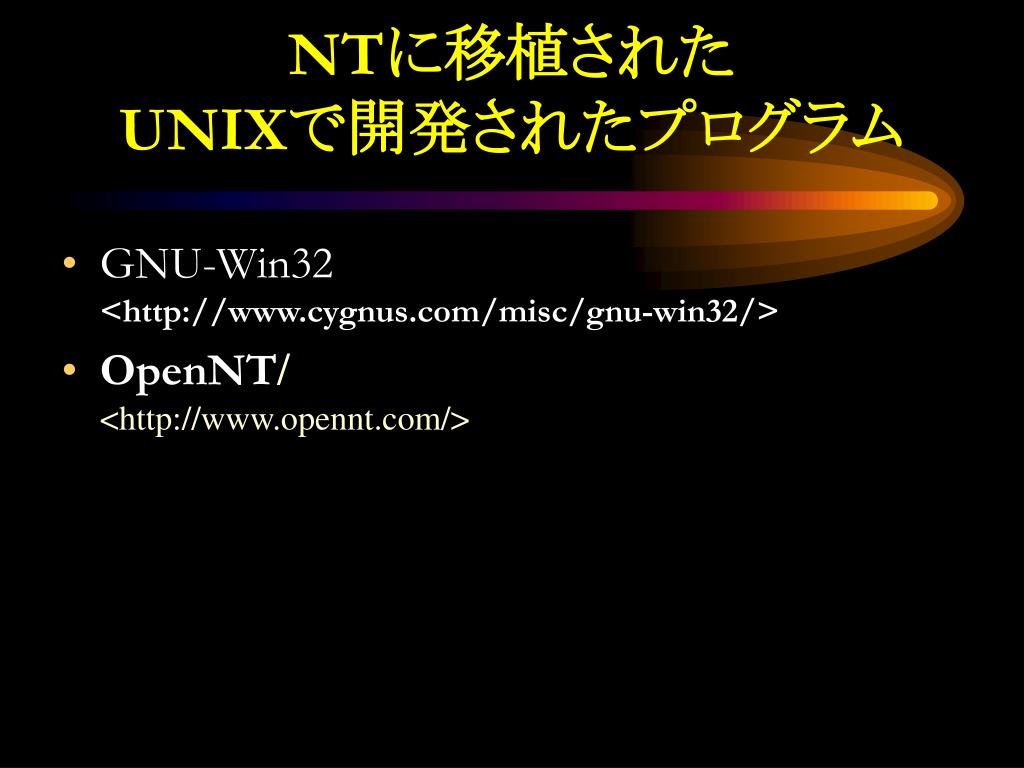 NTに移植されたUNIXで開発されたプログラム • GNU-Win32<http://www.cygnus.com/misc/gnu-win32/> • OpenNT/<http://www.opennt.com/>