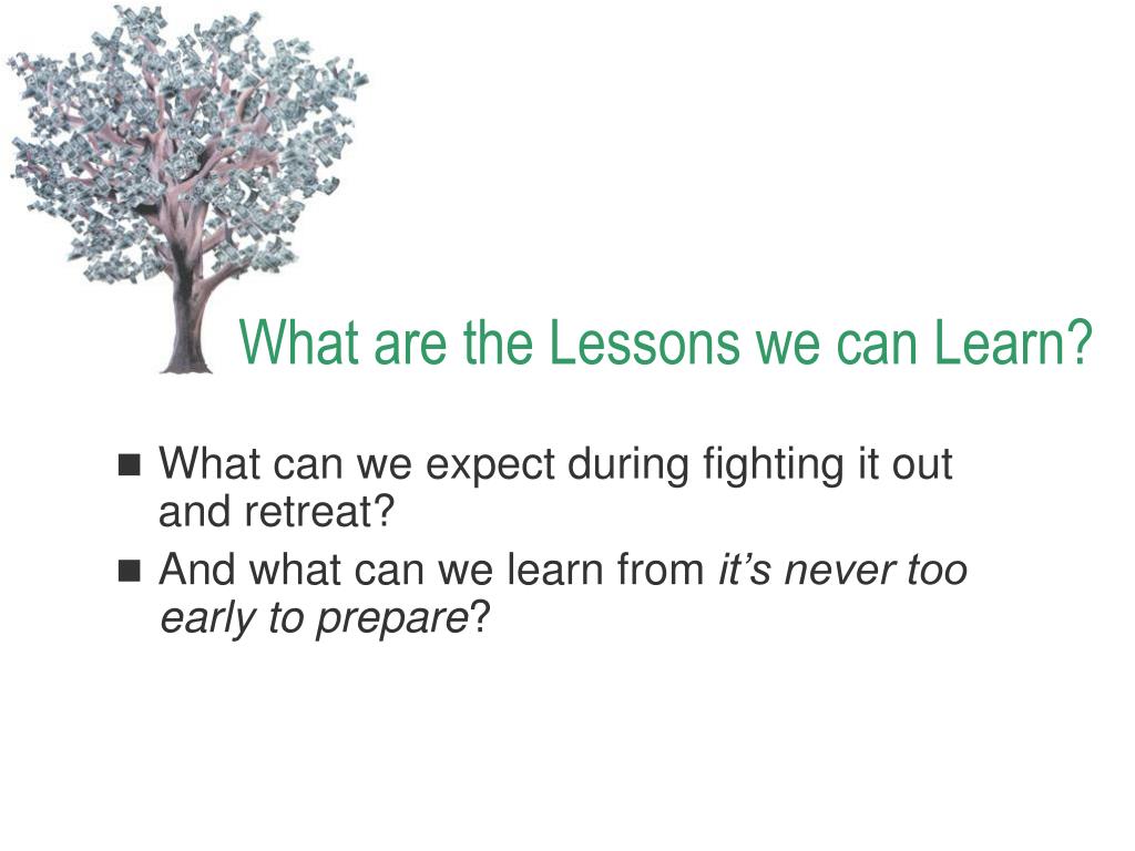 What are the Lessons we can Learn? • What can we expect during fighting it out and retreat? • And what can we learn from it’s never too early to prepare?
