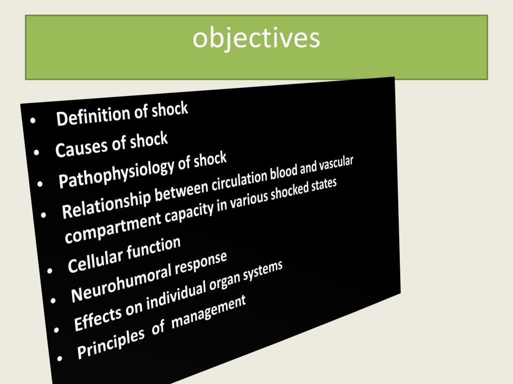 objectives • Definition of shock • Causes of shock • Pathophysiology of shock • Relationship between circulation blood and vascular compartment capacity in various shocked states • Cellular function • Neurohumoral response • Effects on individual organ systems • Principles of management