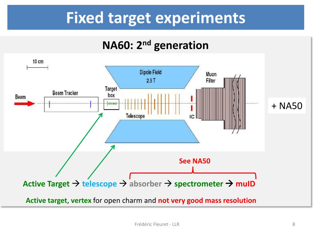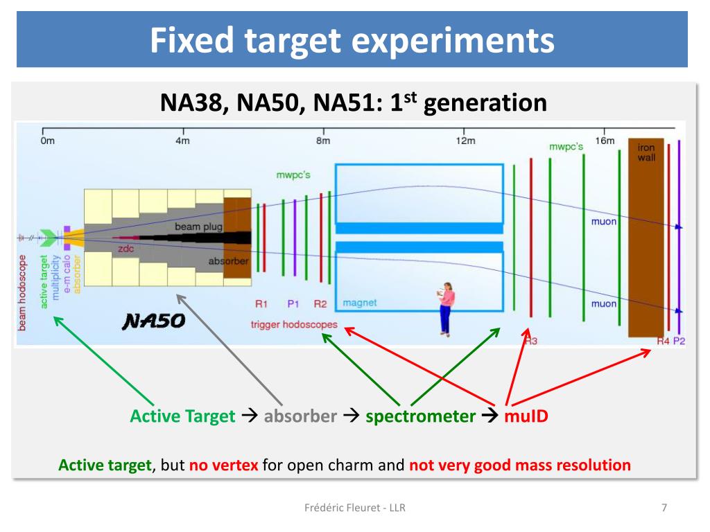 Fixedtargetexperiments NA38, NA50, NA51: 1stgeneration Active Target absorber spectrometermuID Active target, but no vertex for open charm and not very good mass resolution Frédéric Fleuret - LLR