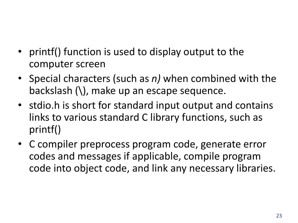 printf() function is used to display output to the computer screen Special characters (such as n) when combined with the backslash (\), make up an escape sequence. stdio.h is short for standard input output and contains links to various standard C library functions, such as printf() C compiler preprocess program code, generate error codes and messages if applicable, compile program code into object code, and link any necessary libraries.