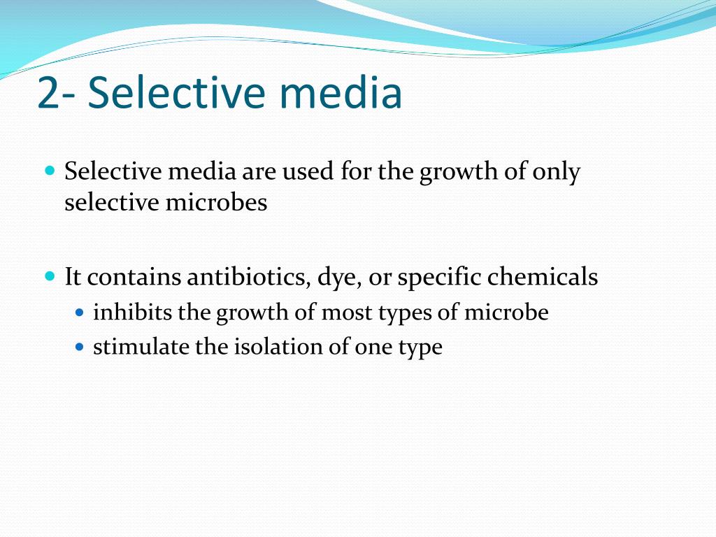2- Selective media • Selective media are used for the growth of only selective microbes • It contains antibiotics, dye, or specific chemicals • inhibits the growth of most types of microbe • stimulate the isolation of one type