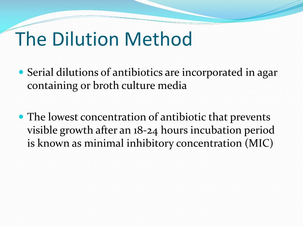 The Dilution Method • Serial dilutions of antibiotics are incorporated in agar containing or broth culture media • The lowest concentration of antibiotic that prevents visible growth after an 18-24 hours incubation period is known as minimal inhibitory concentration (MIC)