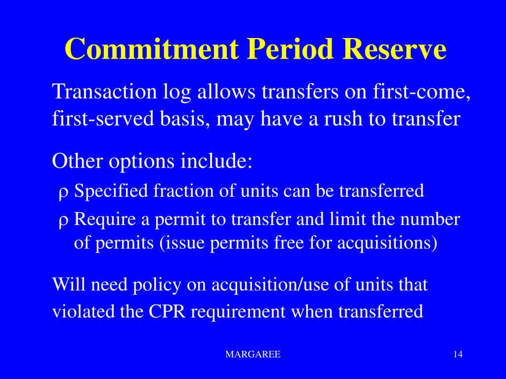 Commitment Period Reserve KP units held in the registry can not be less than the prescribed level Transaction log will identify transfers that would cause reserve requirement to be violated If transaction proceeds anyway, the KP units can not be used for compliance until any questions of implementation have been resolved MARGAREE