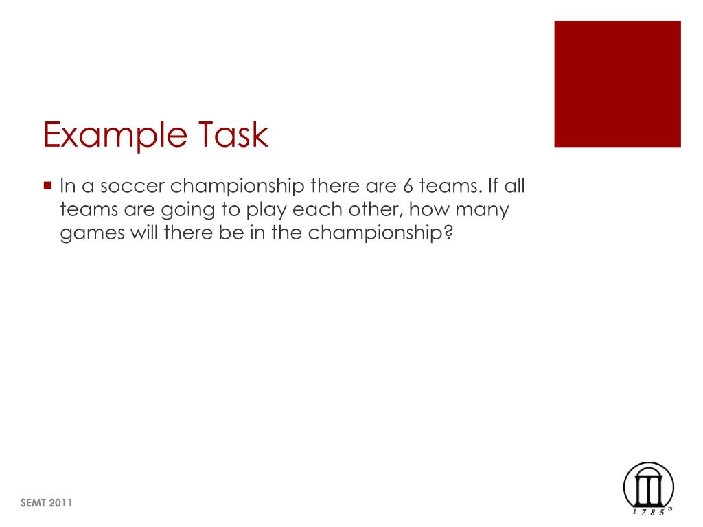 Example Task SEMT 2011 In a soccer championship there are 6 teams. If all teams are going to play each other, how many games will there be in the championship?
