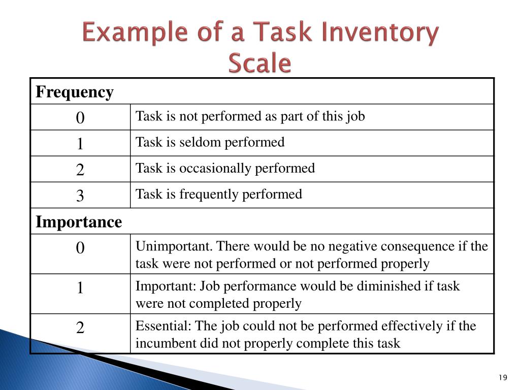 Using the Ratings • Create a chart summarizing the ratings • Add the frequency and importance ratings to form a combined rating for each task • Include the task in the job description if: • Average rating is greater than 0.5 • Include the task in the task inventory if: • (1) the average rating of (F) or Importance (I) greater than 0. 5 • (2)Combined Ratings (CR) of more than 2