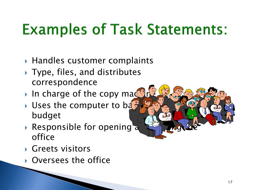 Examples of Task Statements: • Handles customer complaints • Type, files, and distributes correspondence • In charge of the copy machine • Uses the computer to balance department budget • Responsible for opening and closing the office • Greets visitors • Oversees the office