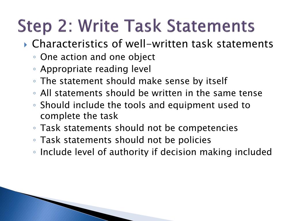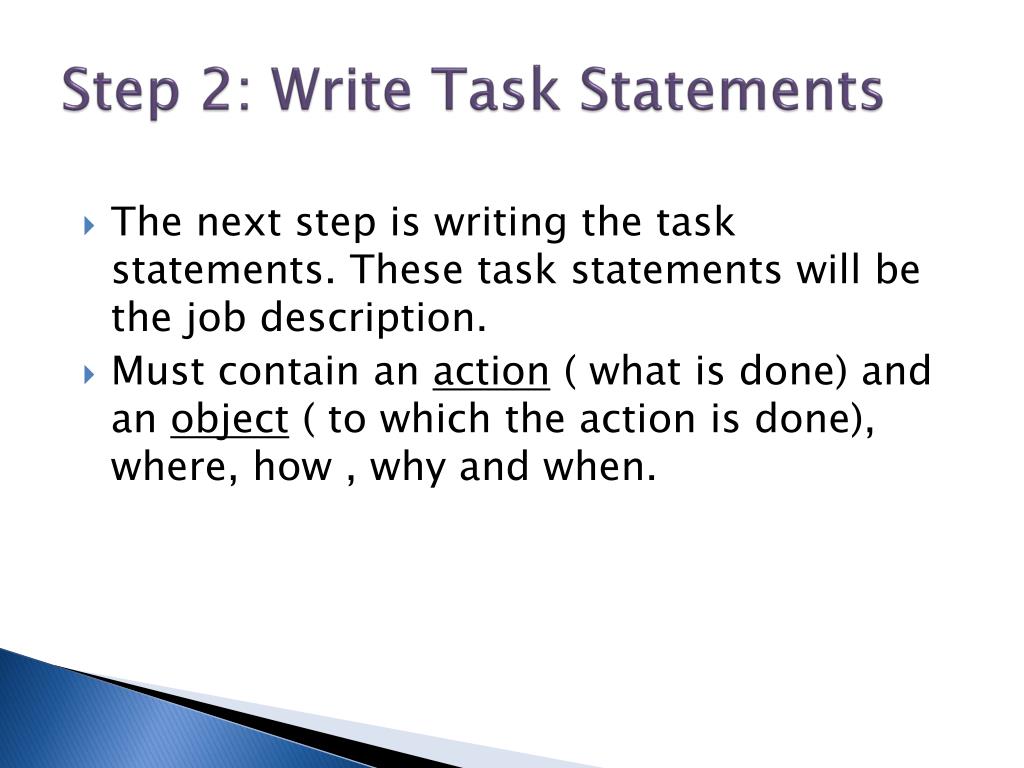 Step 2: Write Task Statements • The next step is writing the task statements. These task statements will be the job description. • Must contain an action ( what is done) and an object ( to which the action is done), where, how , why and when.