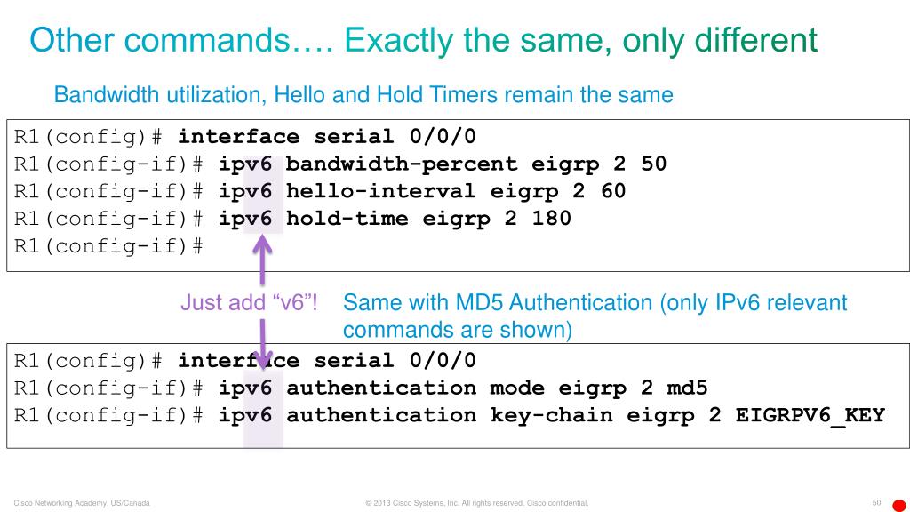 Other commands…. Exactly the same, only different Bandwidth utilization, Hello and Hold Timers remain the same R1(config)# interface serial 0/0/0 R1(config-if)# ipv6 bandwidth-percent eigrp 2 50 R1(config-if)# ipv6 hello-interval eigrp 2 60 R1(config-if)# ipv6 hold-time eigrp 2 180 R1(config-if)# Just add “v6”! Same with MD5 Authentication (only IPv6 relevant commands are shown) R1(config)# interface serial 0/0/0 R1(config-if)# ipv6 authentication mode eigrp 2 md5 R1(config-if)# ipv6 authentication key-chain eigrp 2 EIGRPV6_KEY