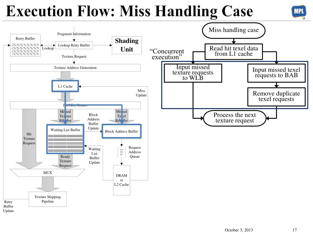 Execution Flow: Miss Handling Case Miss handling case Read hit texel data from L1 cache “Concurrent execution” Input missed texture requests to WLB Input missed texel requests to BAB Remove duplicate texel requests Process the next texture request