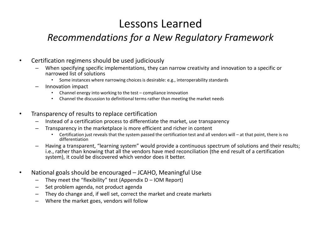 Lessons LearnedRecommendations for a New Regulatory Framework • Certification regimens should be used judiciously • When specifying specific implementations, they can narrow creativity and innovation to a specific or narrowed list of solutions • Some instances where narrowing choices is desirable: e.g., interoperability standards • Innovation impact • Channel energy into working to the test – compliance innovation • Channel the discussion to definitional terms rather than meeting the market needs • Transparency of results to replace certification • Instead of a certification process to differentiate the market, use transparency • Transparency in the marketplace is more efficient and richer in content • Certification just reveals that the system passed the certification test and all vendors will – at that point, there is no differentiation • Having a transparent, “learning system” would provide a continuous spectrum of solutions and their results; i.e., rather than knowing that all the vendors have med reconciliation (the end result of a certification system), it could be discovered which vendor does it better. • National goals should be encouraged – JCAHO, Meaningful Use • They meet the “flexibility” test (Appendix D – IOM Report) • Set problem agenda, not product agenda • They do change and, if well set, correct the market and create markets • Where the market goes, vendors will follow