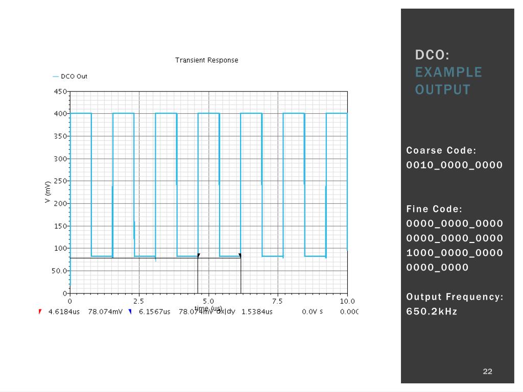 DCO: Example output Coarse Code: 0010_0000_0000 Fine Code: 0000_0000_0000 0000_0000_0000 1000_0000_0000 0000_0000 Output Frequency: 650.2kHz