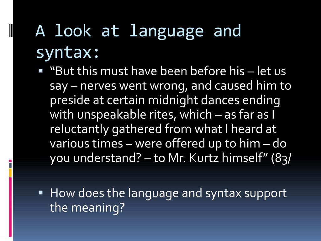A look at language and syntax: • “But this must have been before his – let us say – nerves went wrong, and caused him to preside at certain midnight dances ending with unspeakable rites, which – as far as I reluctantly gathered from what I heard at various times – were offered up to him – do you understand? – to Mr. Kurtz himself” (83/ • How does the language and syntax support the meaning?