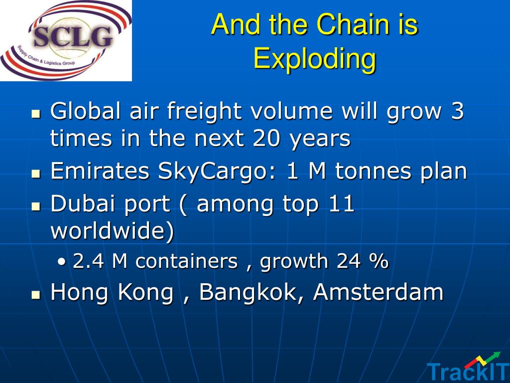 And the Chain is Exploding • Global air freight volume will grow 3 times in the next 20 years • Emirates SkyCargo: 1 M tonnes plan • Dubai port ( among top 11 worldwide) • 2.4 M containers , growth 24 % • Hong Kong , Bangkok, Amsterdam