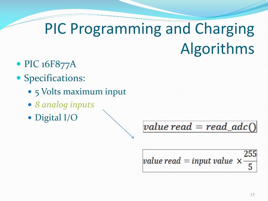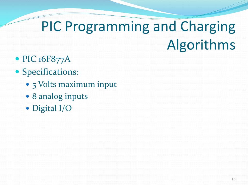 PIC Programming and Charging Algorithms • PIC 16F877A • Specifications: • 5 Volts maximum input • 8analog inputs • Digital I/O