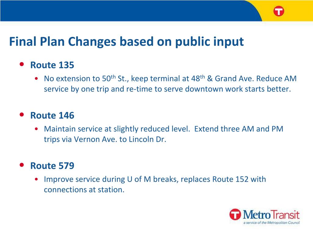 Final Plan Changes based on public input • Route 135 • No extension to 50th St., keep terminal at 48th & Grand Ave. Reduce AM service by one trip and re-time to serve downtown work starts better. • Route 146 • Maintain service at slightly reduced level. Extend three AM and PM trips via Vernon Ave. to Lincoln Dr. • Route 579 • Improve service during U of M breaks, replaces Route 152 with connections at station.