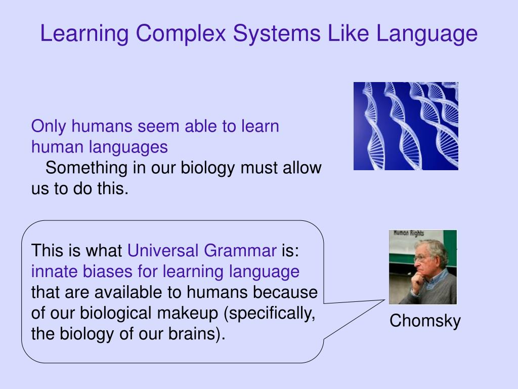 Learning Complex Systems Like Language Only humans seem able to learn human languages Something in our biology must allow us to do this. This is what Universal Grammar is: innate biases for learning language that are available to humans because of our biological makeup (specifically, the biology of our brains). Chomsky