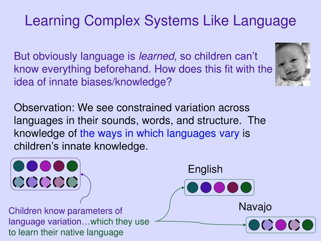 Learning Complex Systems Like Language The big point: Even if children have innate knowledge of language structure, we still need to understand how they learn what the correct structural properties are for their particular language.One idea is to remember that children are good at tracking statistical information (like transitional probabilities) in the language data they hear. English Navajo Children know parameters of language variation…which they use to learn their native language