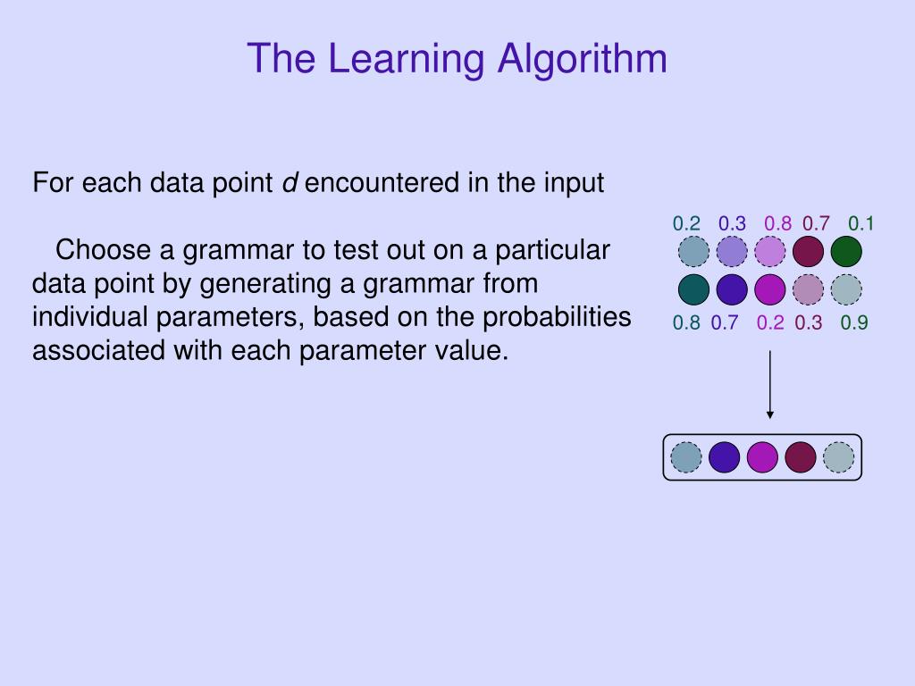 The Learning Algorithm For each data point d encountered in the input Choose a grammar to test out on a particular data point by generating a grammar from individual parameters, based on the probabilities associated with each parameter value. 0.2 0.3 0.8 0.7 0.1 0.8 0.7 0.2 0.3 0.9