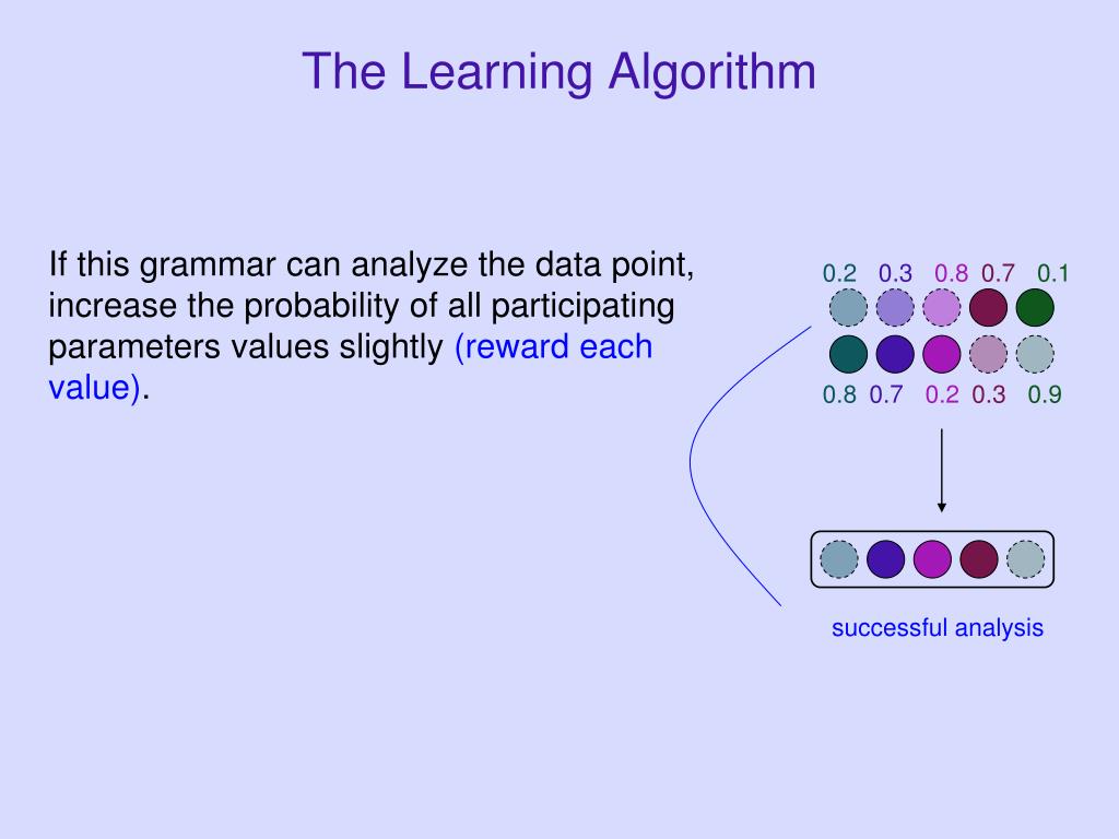 The Learning Algorithm If this grammar can analyze the data point, increase the probability of all participating parameters values slightly (reward each value). 0.2 0.3 0.8 0.7 0.1 0.8 0.7 0.2 0.3 0.9 successful analysis