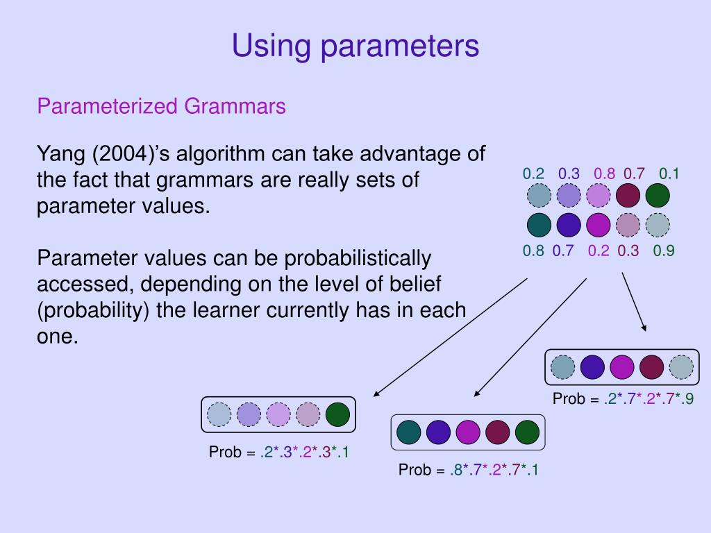 Using parameters Parameterized Grammars Yang (2004)’s algorithm can take advantage of the fact that grammars are really sets of parameter values. Parameter values can be probabilistically accessed, depending on the level of belief (probability) the learner currently has in each one. 0.2 0.3 0.8 0.7 0.1 0.8 0.7 0.2 0.3 0.9 Prob =.2*.7*.2*.7*.9 Prob =.2*.3*.2*.3*.1 Prob =.8*.7*.2*.7*.1