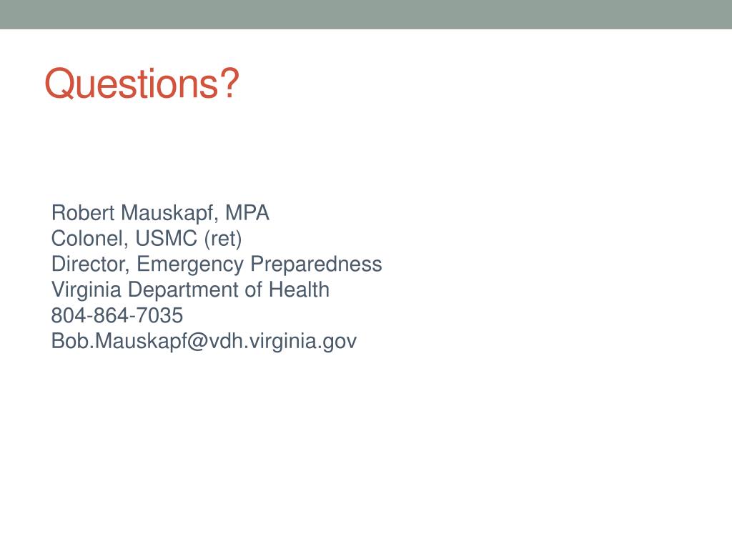 Questions? Robert Mauskapf, MPA Colonel, USMC (ret) Director, Emergency Preparedness Virginia Department of Health 804-864-7035 Bob.Mauskapf@vdh.virginia.gov
