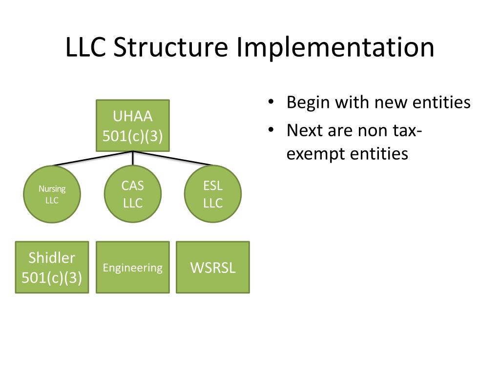 LLC Structure Implementation • Begin with new entities • Next are non tax-exempt entities UHAA 501(c)(3) CAS LLC ESL LLC Nursing LLC Shidler 501(c)(3) Engineering WSRSL