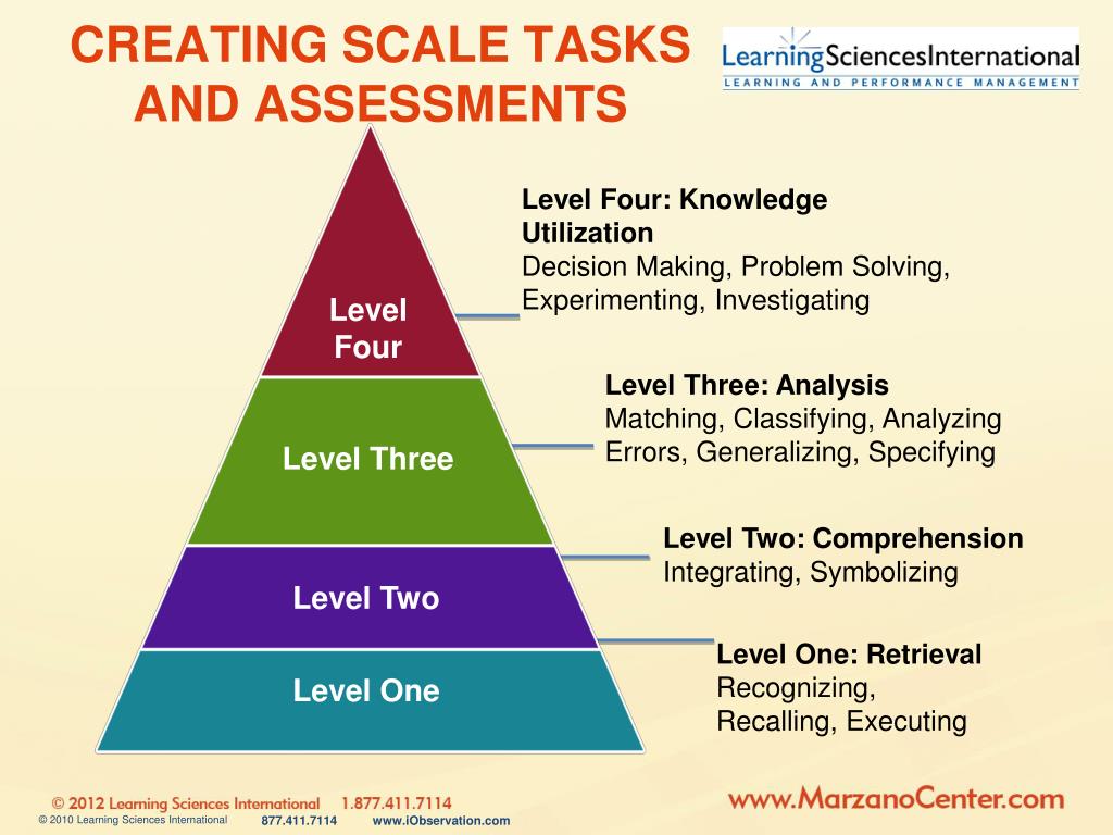 Level Four: Knowledge Utilization Decision Making, Problem Solving, Experimenting, Investigating Creating Scale Tasks and Assessments Level Four Level Three: Analysis Matching, Classifying, Analyzing Errors, Generalizing, Specifying Level Three Level Two: Comprehension Integrating, Symbolizing Level Two Level One: Retrieval Recognizing, Recalling, Executing Level One