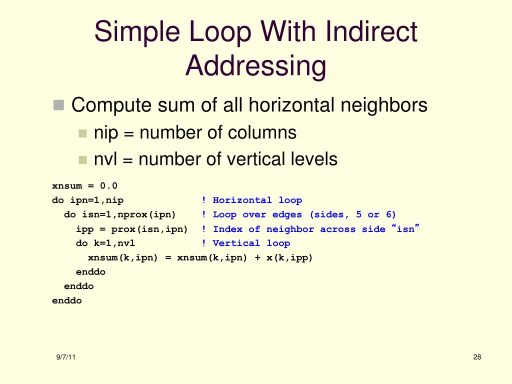 Simple Loop With Indirect Addressing • Compute sum of all horizontal neighbors • nip = number of columns • nvl = number of vertical levels xnsum = 0.0 do ipn=1,nip ! Horizontal loop do isn=1,nprox(ipn) ! Loop over edges (sides, 5 or 6) ipp = prox(isn,ipn) ! Index of neighbor across side “isn” do k=1,nvl ! Vertical loop xnsum(k,ipn) = xnsum(k,ipn) + x(k,ipp) enddo enddo enddo