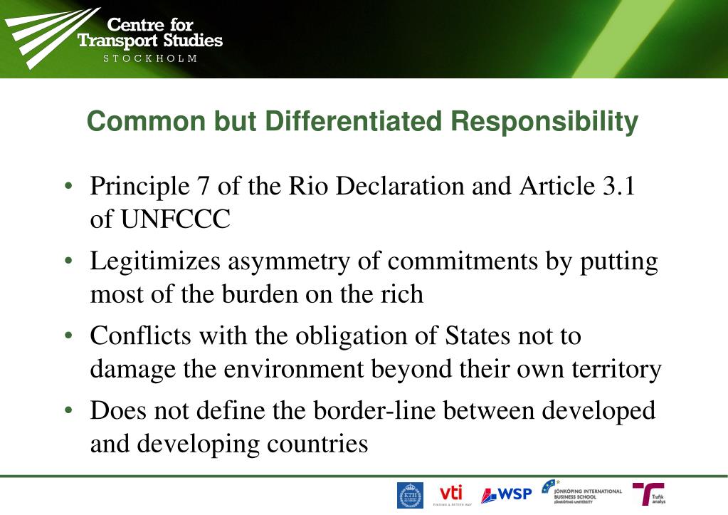 Common but Differentiated Responsibility • Principle 7 of the Rio Declaration and Article 3.1 of UNFCCC • Legitimizes asymmetry of commitments by putting most of the burden on the rich • Conflicts with the obligation of States not to damage the environment beyond their own territory • Does not define the border-line between developed and developing countries