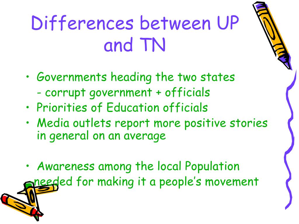 Differences between UP and TN • Governments heading the two states - corrupt government + officials • Priorities of Education officials • Media outlets report more positive stories in general on an average • Awareness among the local Population -needed for making it a people’s movement